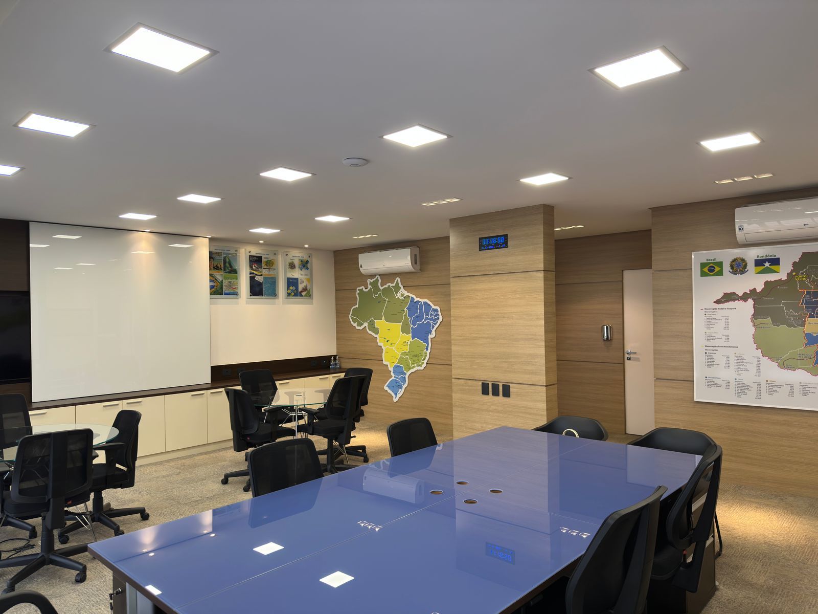 Sala de Reunião Premium: Equipada para profissionalismo: mesa para 8 pessoas (com possibilidade de ampliação), Smart TV para apresentações e quadro branco para metas.